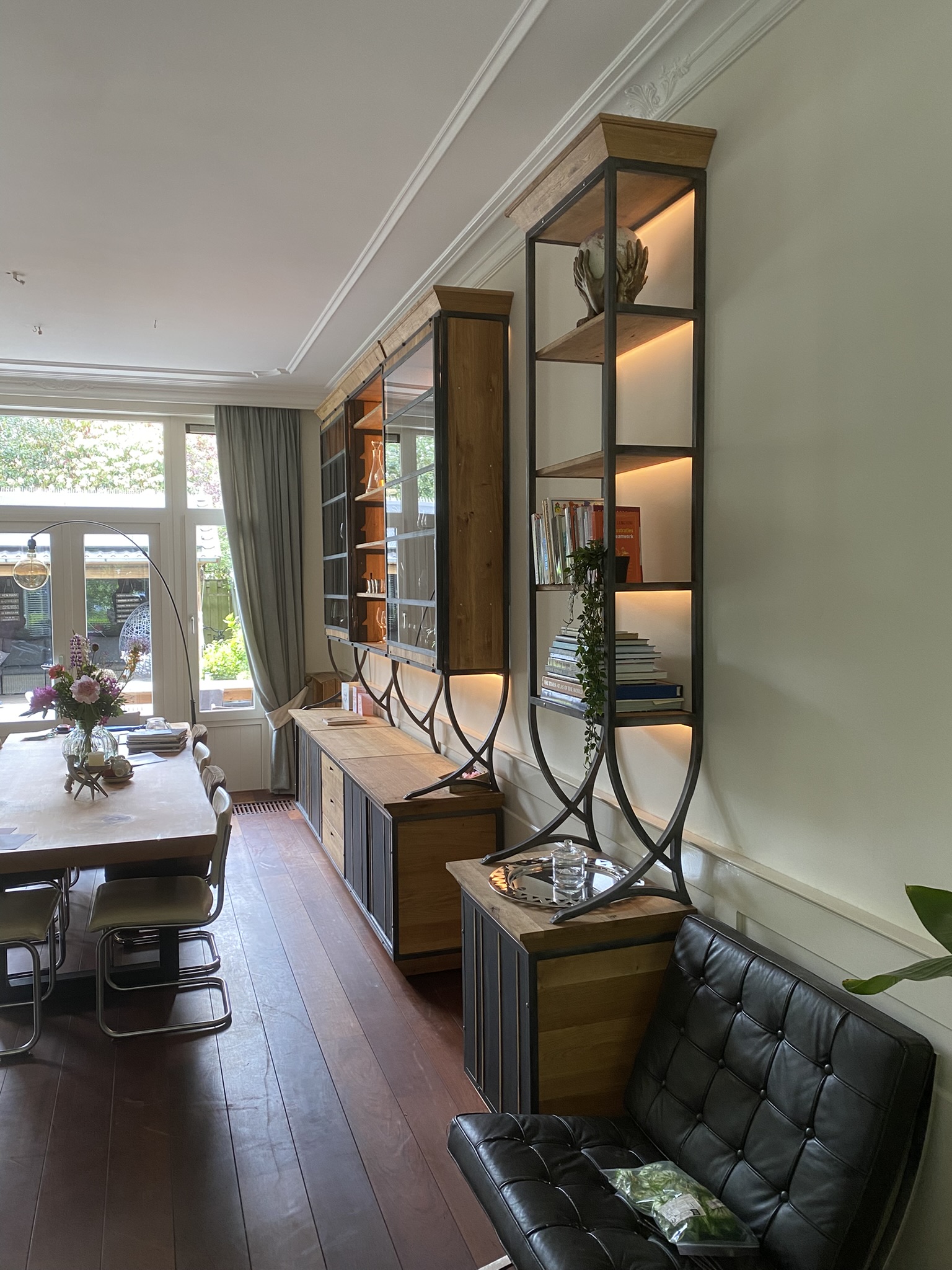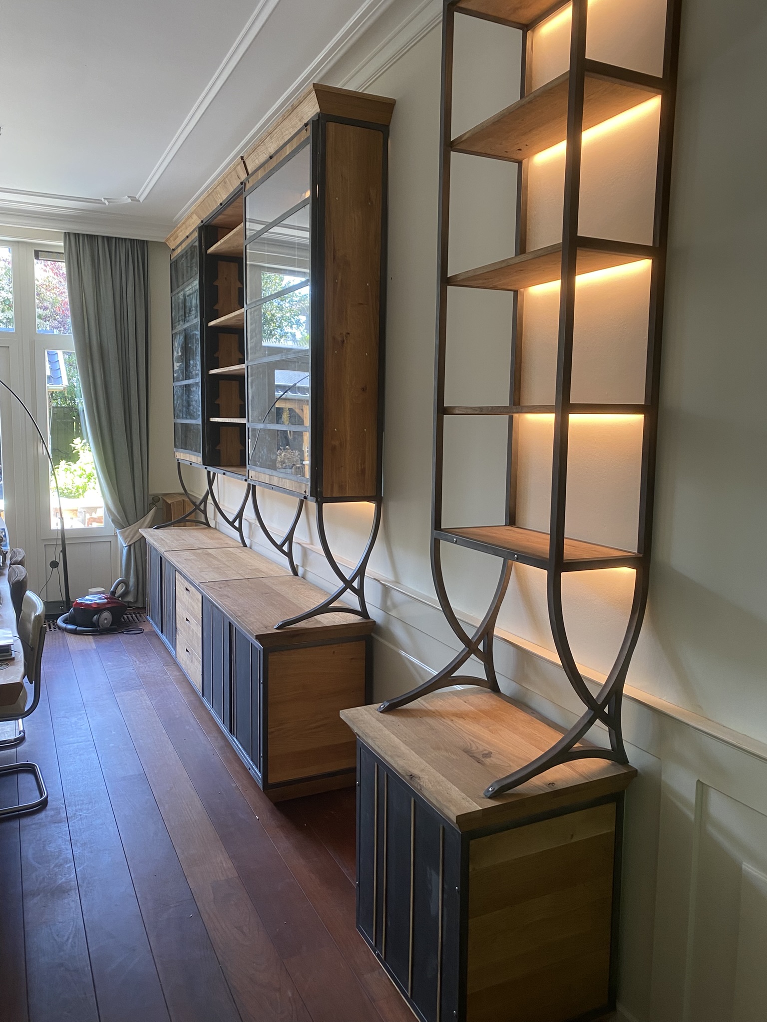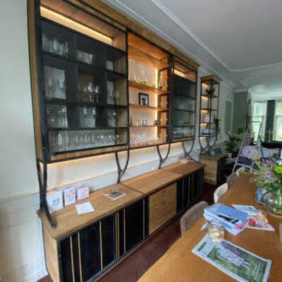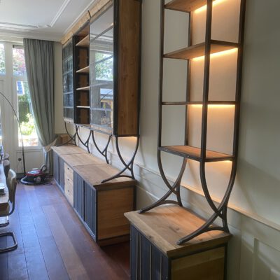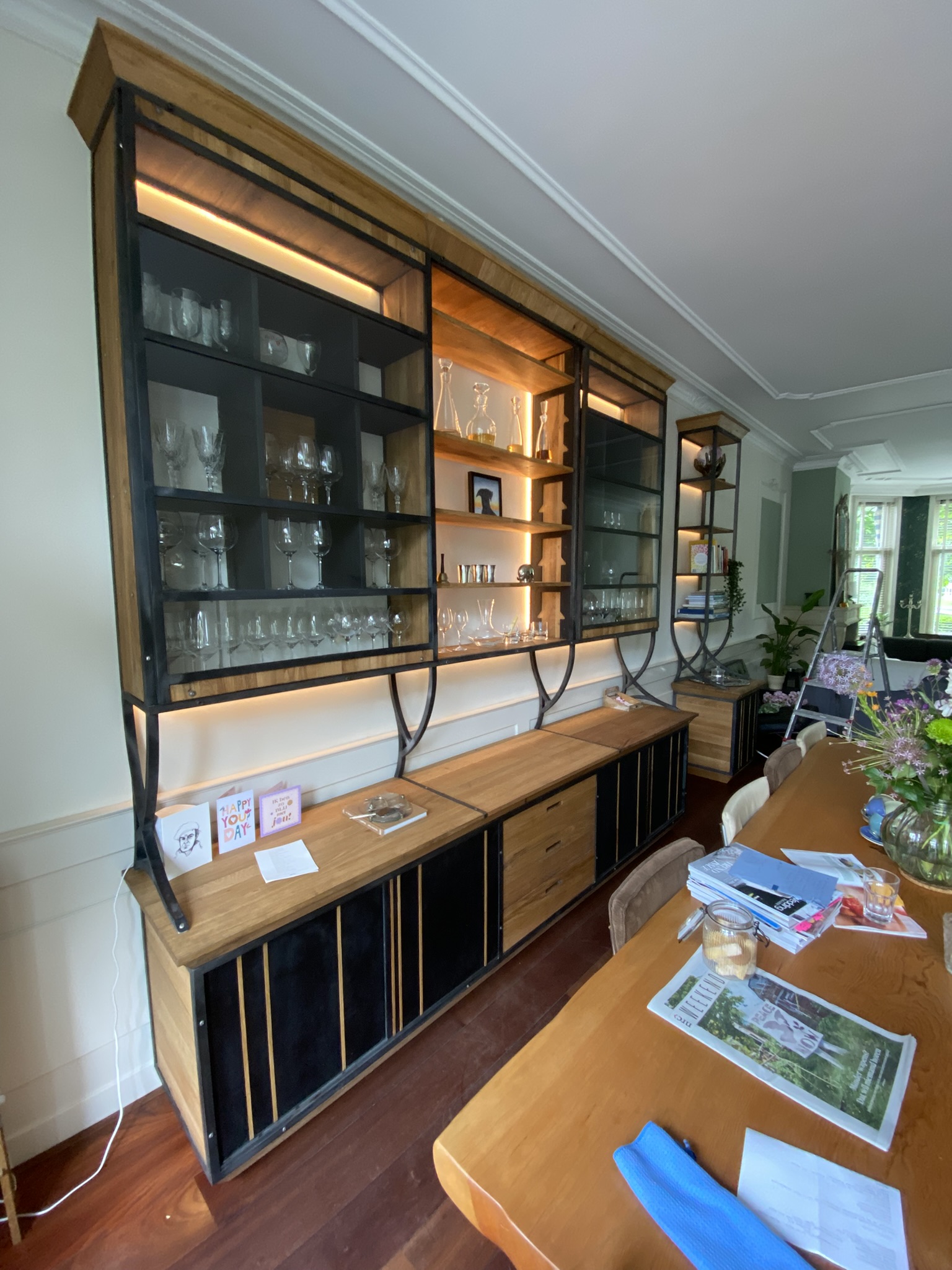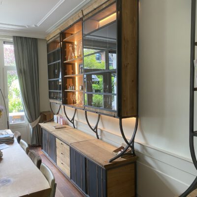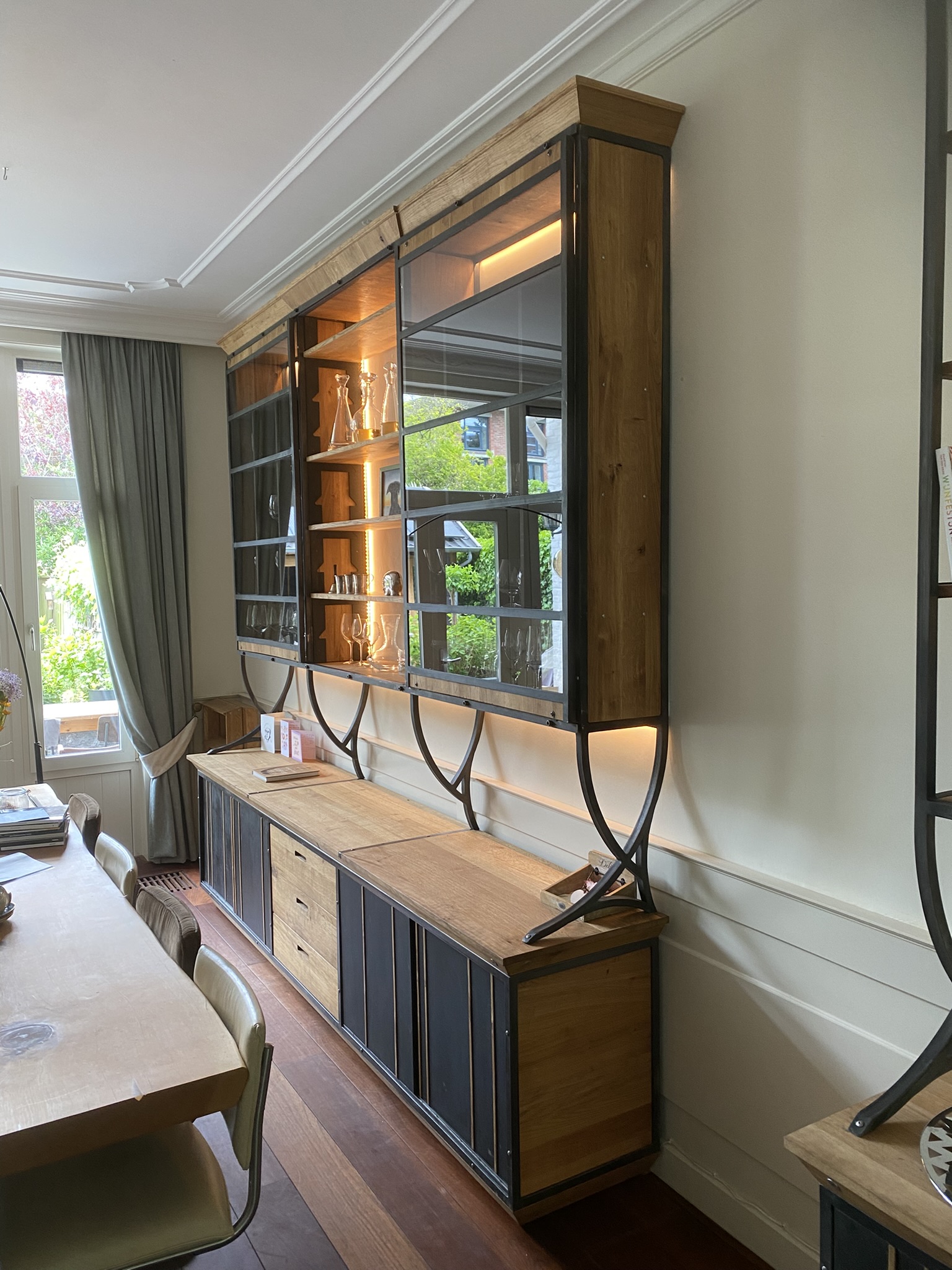 Een kast van staal en hout met schuifdeuren van staal en glas. Verlichting achter de planken, bedient met een touchknop en dimbaar.