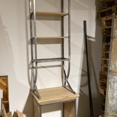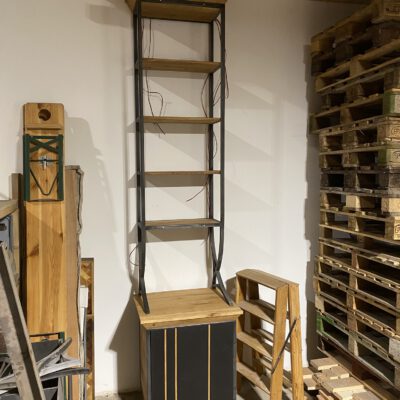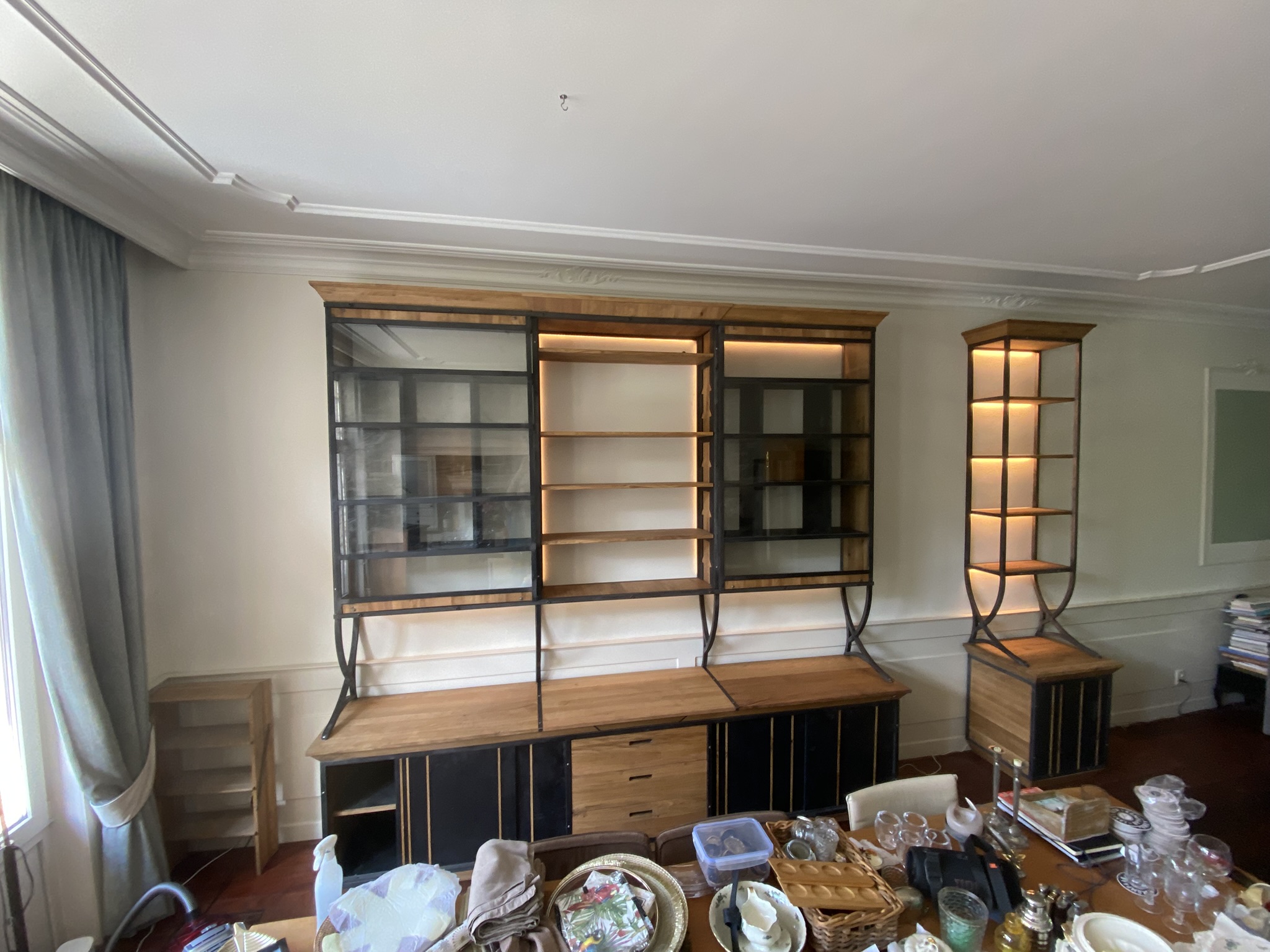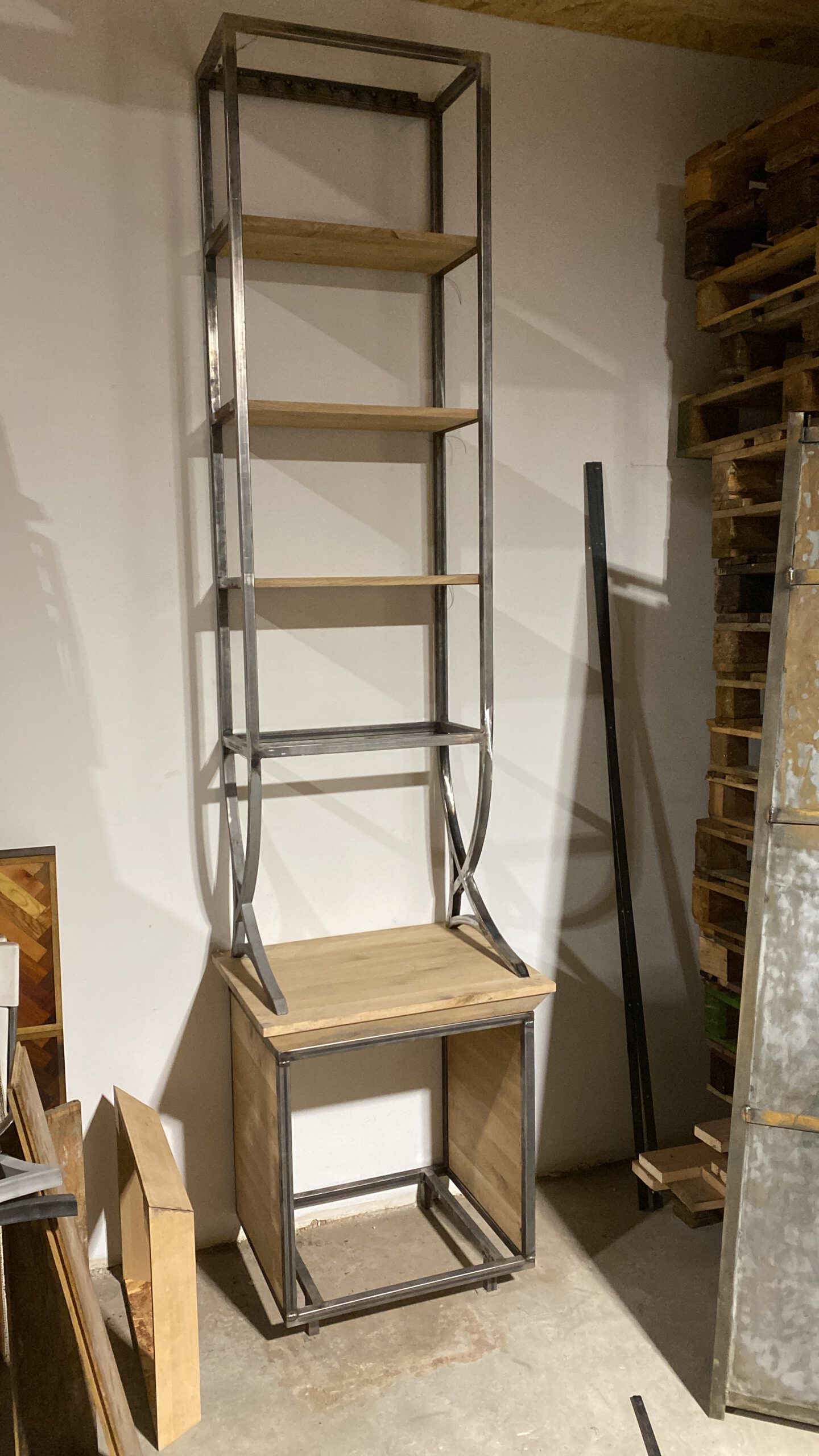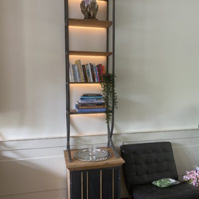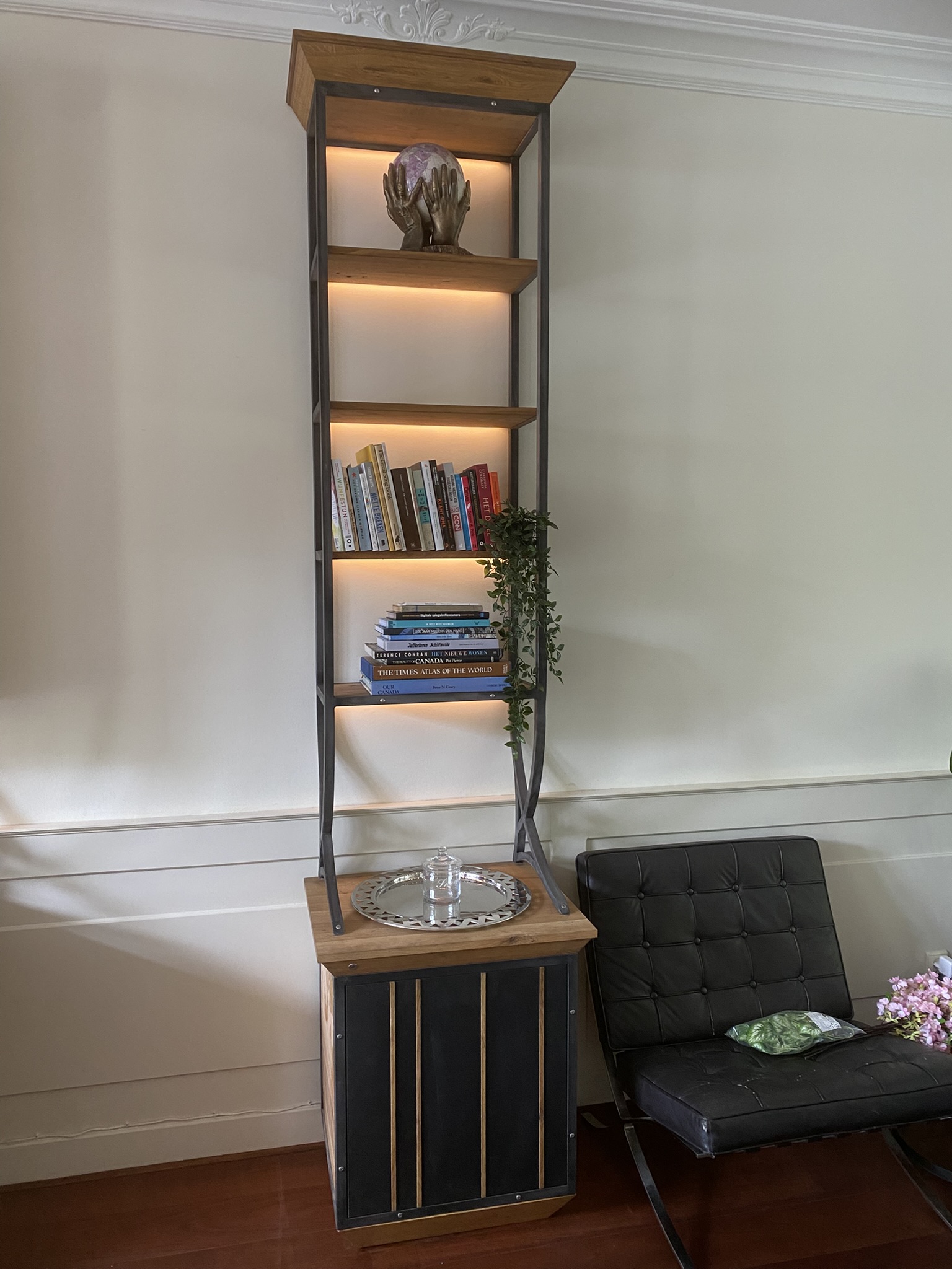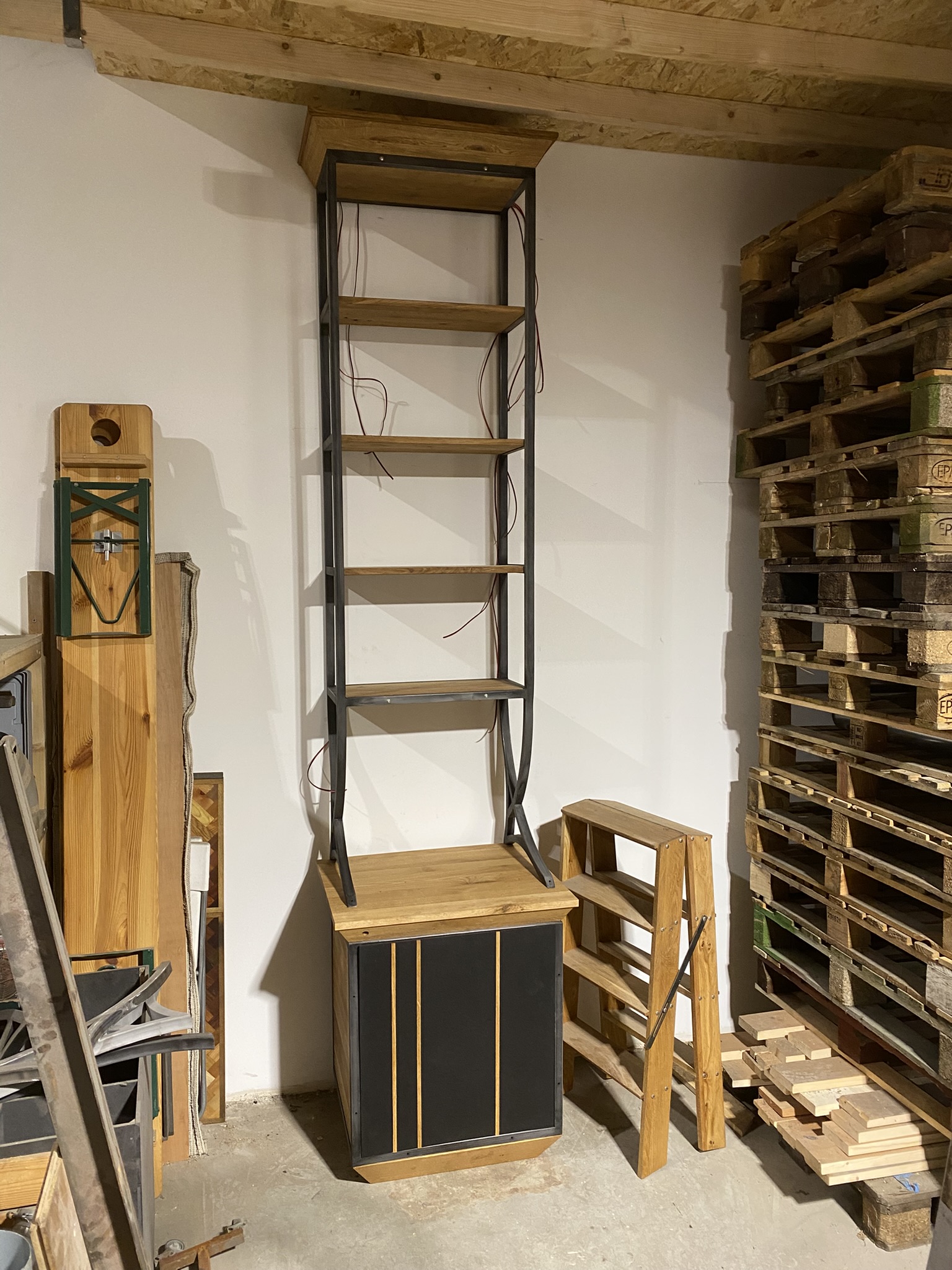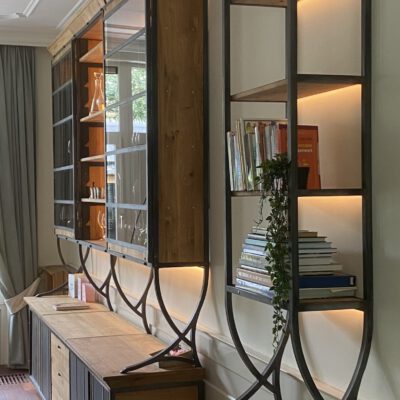 Een kast van staal en hout met schuifdeuren van staal en glas. Verlichting achter de planken, bedient met een touchknop en dimbaar.