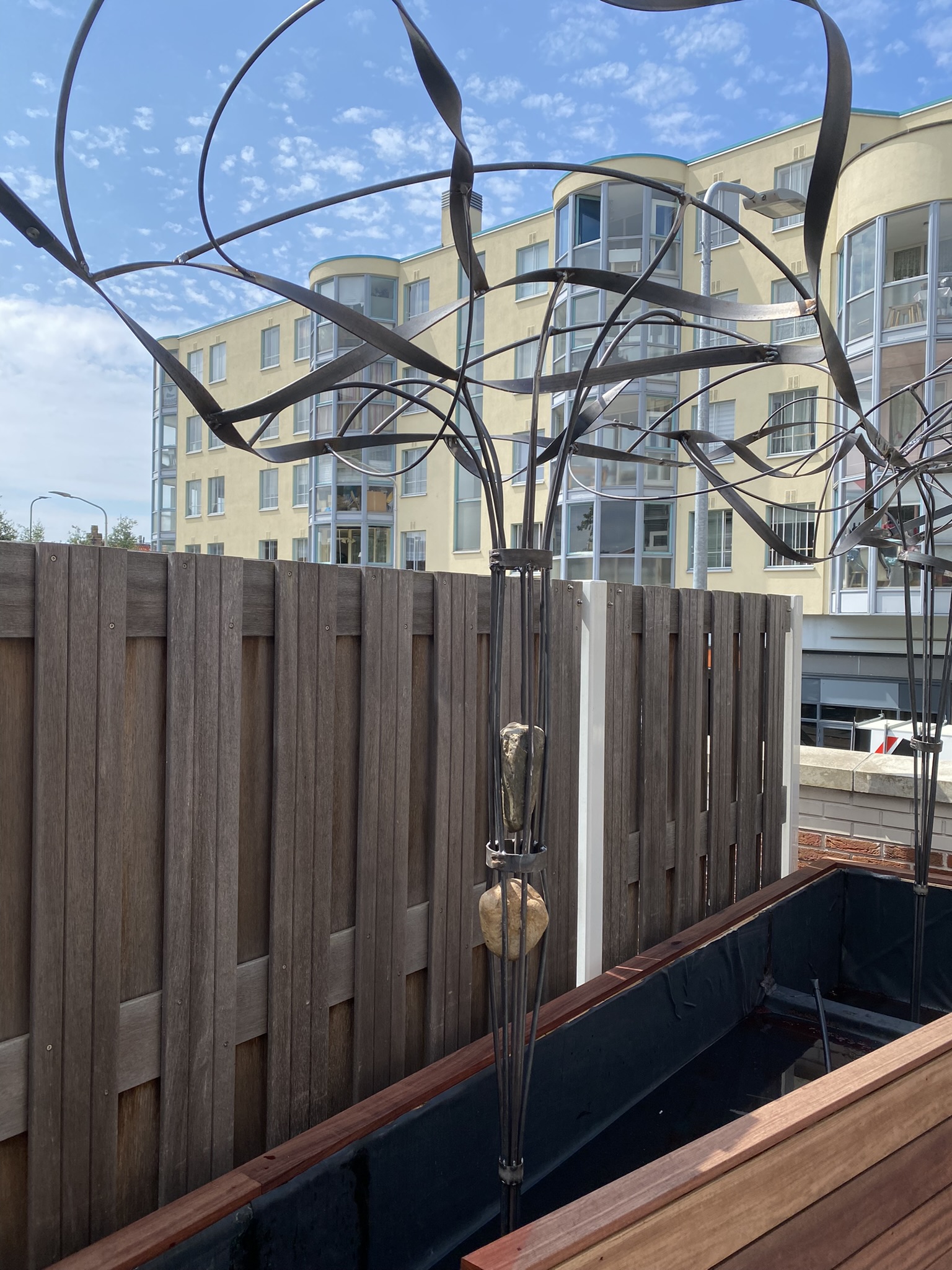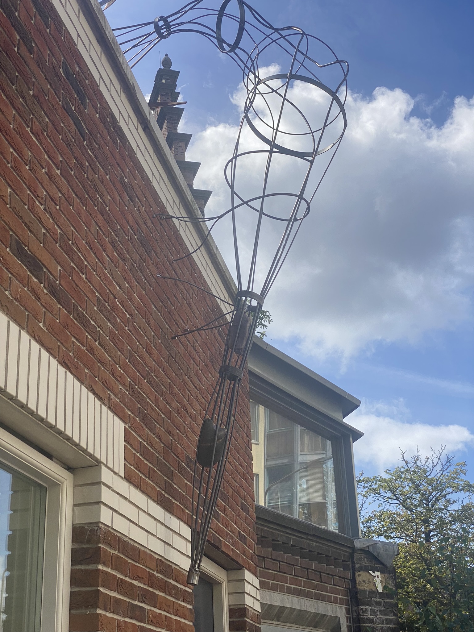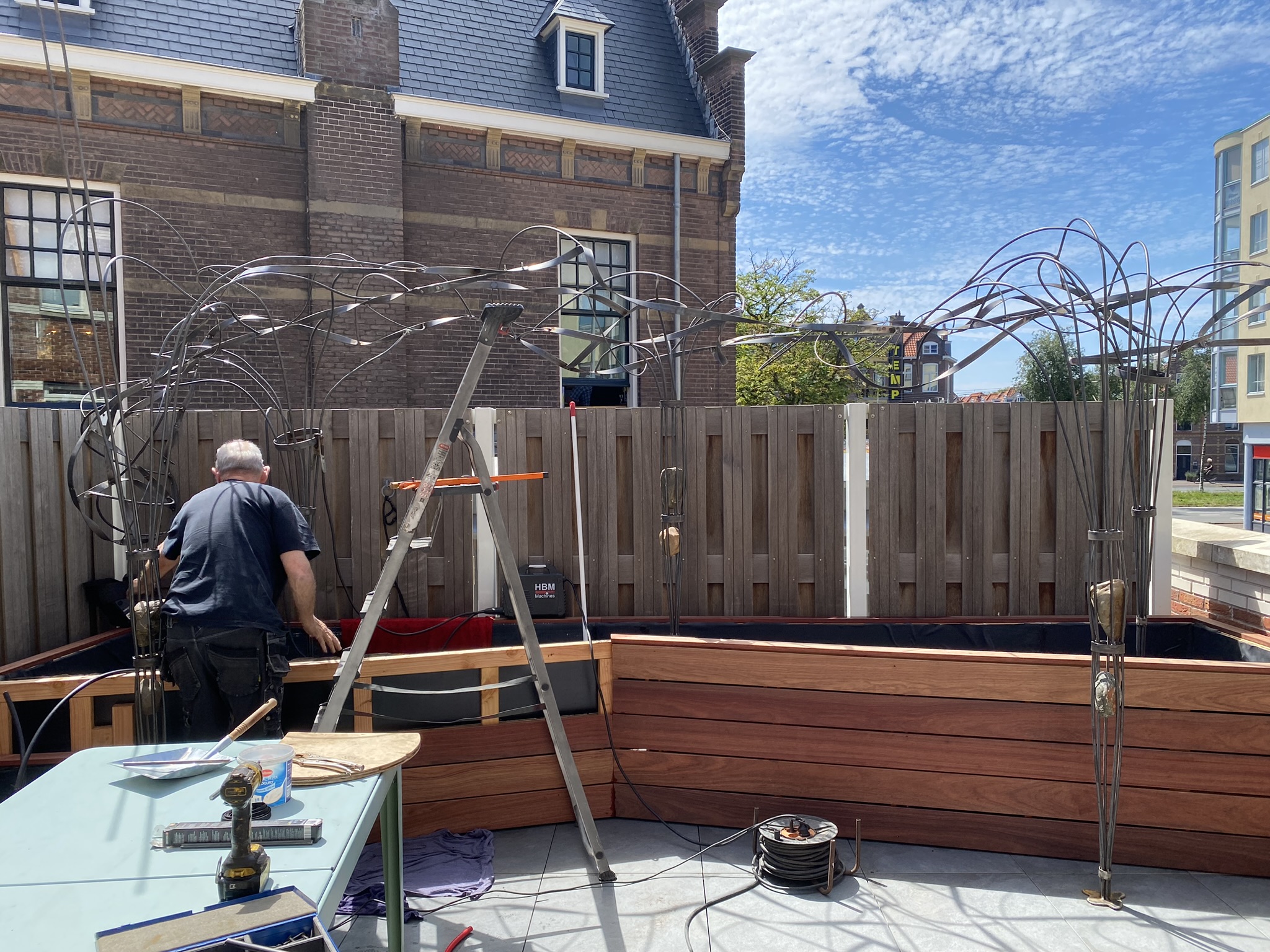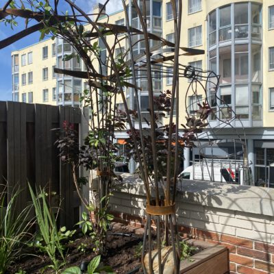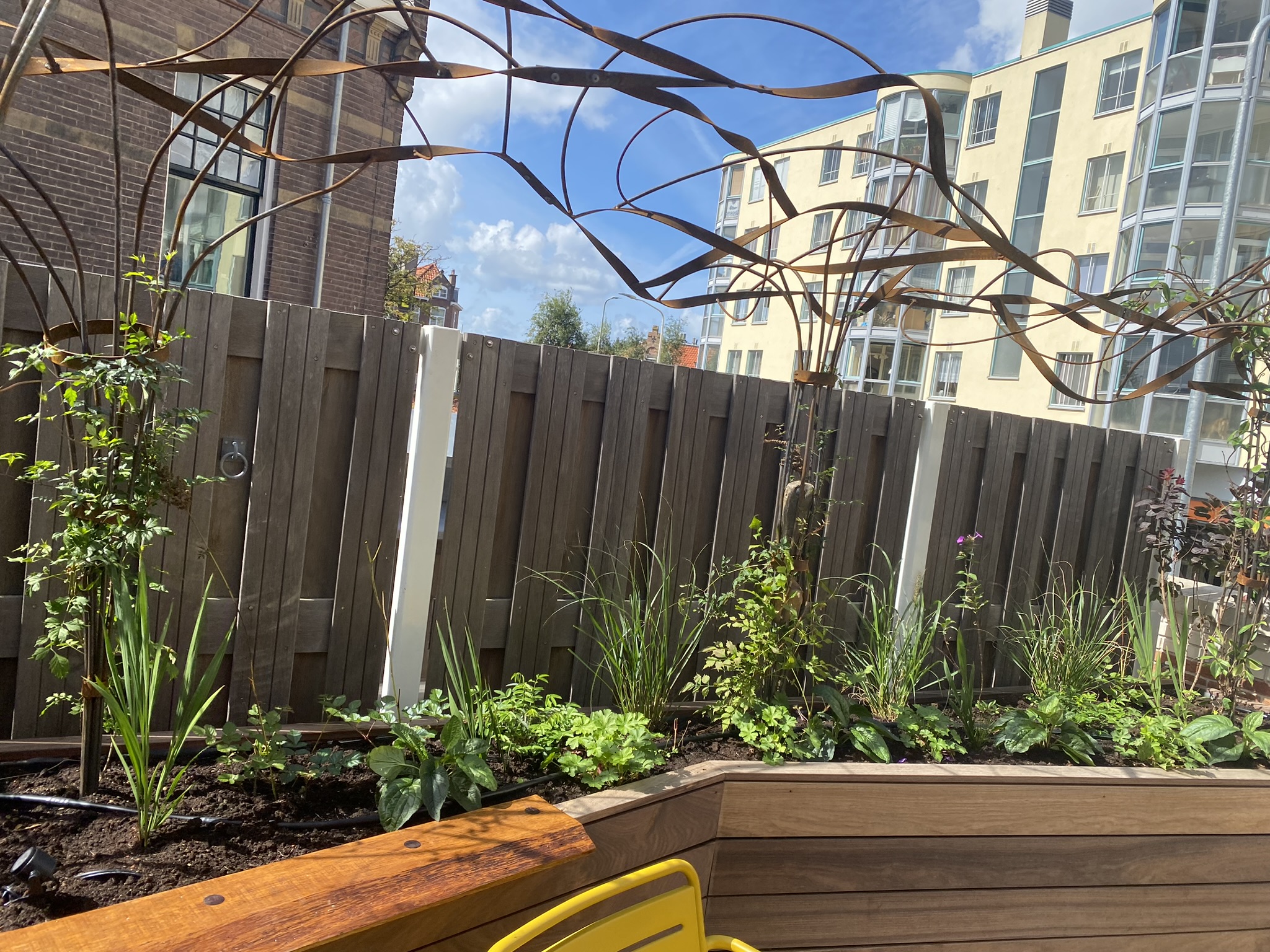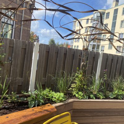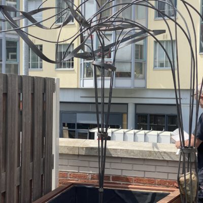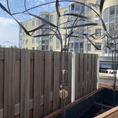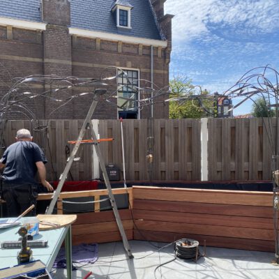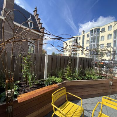Een boomachtige constructie die snel vefrkleurd van blankstaal naar mooi bruin aangeslagen. Een constructie die visueel de balustrade over klimdt en afdaalt naar het straatniveau. De blauwe regen vindt al snel zijn weg van de volle gond op straatniveau via de pergola naar het dakterras….