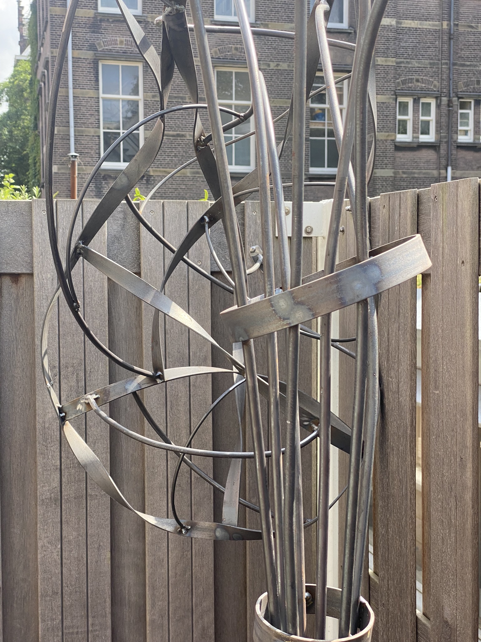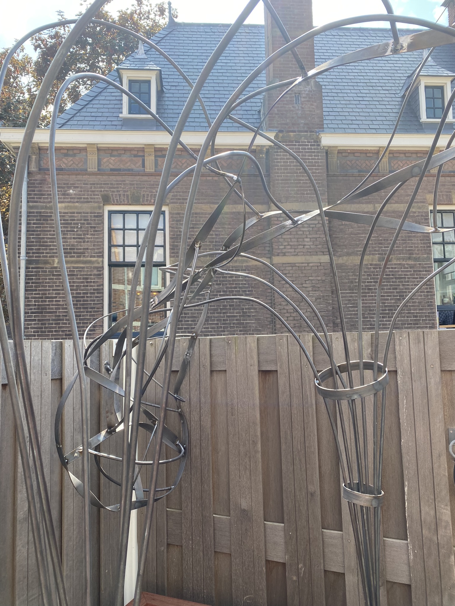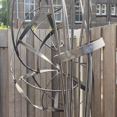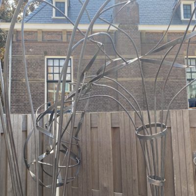 In het ontwerp kwam een boomstructuur naar voren. Harald deelde zijn ontwerp in potloodschetsen en ging daarmee freestylend aan de gang. Staal staal en nog eens staal, rond 8 en rond 10 en stripstaal. Op twee punten een lichtarmatuur van een gezandstraald glazen potje.