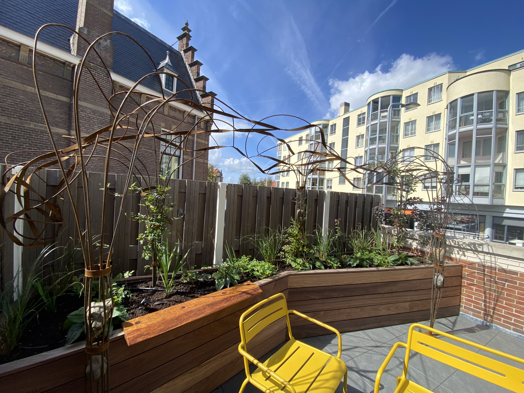 Op een dakterras van een haags huis werd een plantenbak gemaakt. om de te planten struiken wat houvast te geven en een volume alvast te initiëren kwam er een vraag naar een pergola. Maar niet de standaard, niet de lompe, niet de truttige versie…