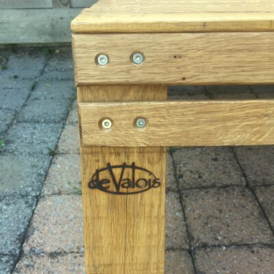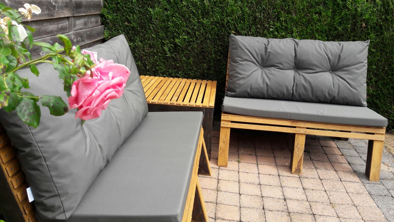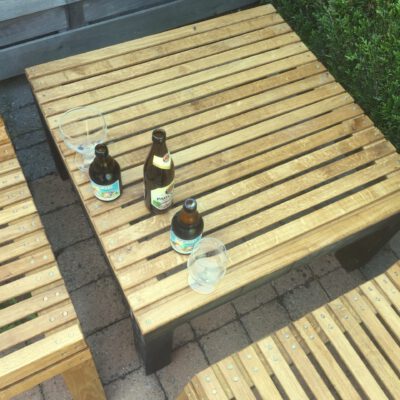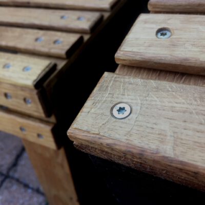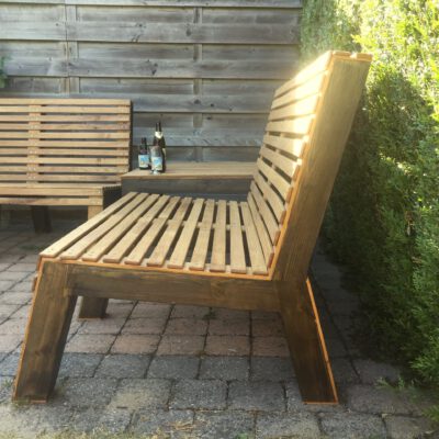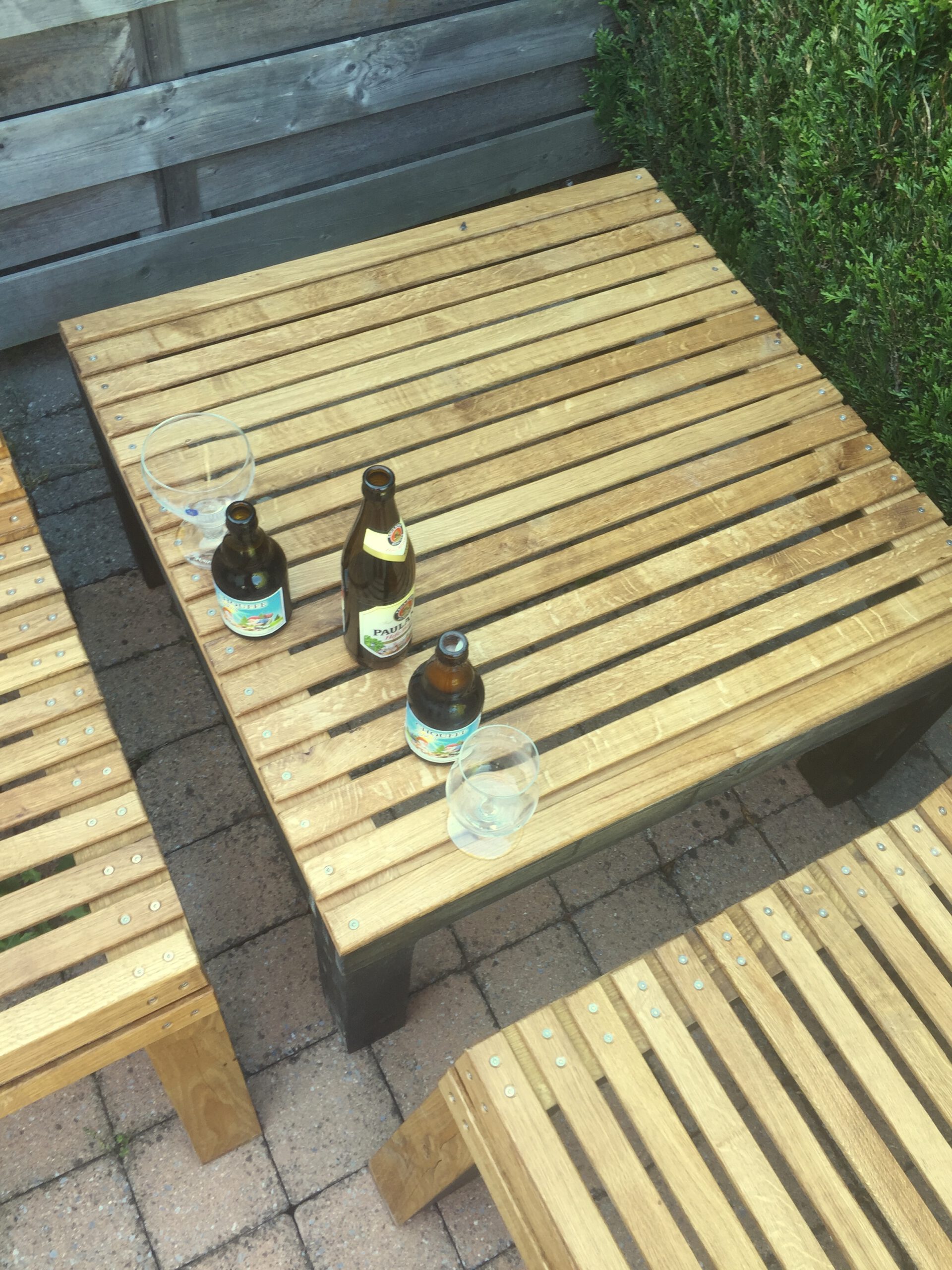 Het resultaat werd een set van twee eiken banken en een bijzettafel die ook in de hoek van de set kan staan. De banken zitten met of zonder kussens lekker relaxed. De banken zijn gemaakt van een houten frame die afgewerkt is met eiken latten.