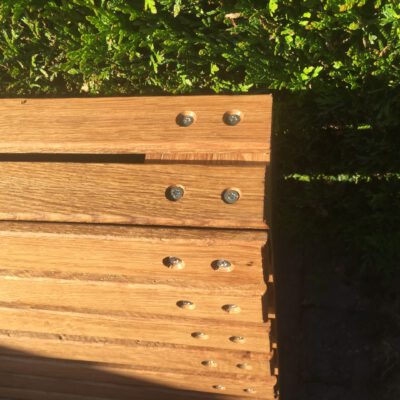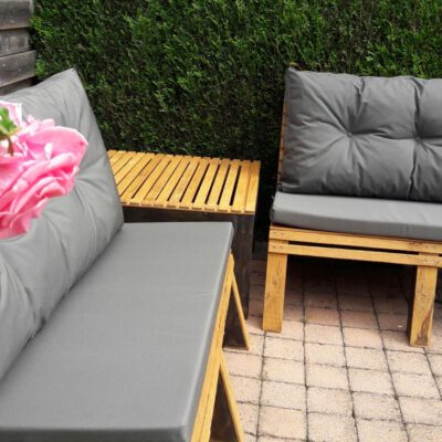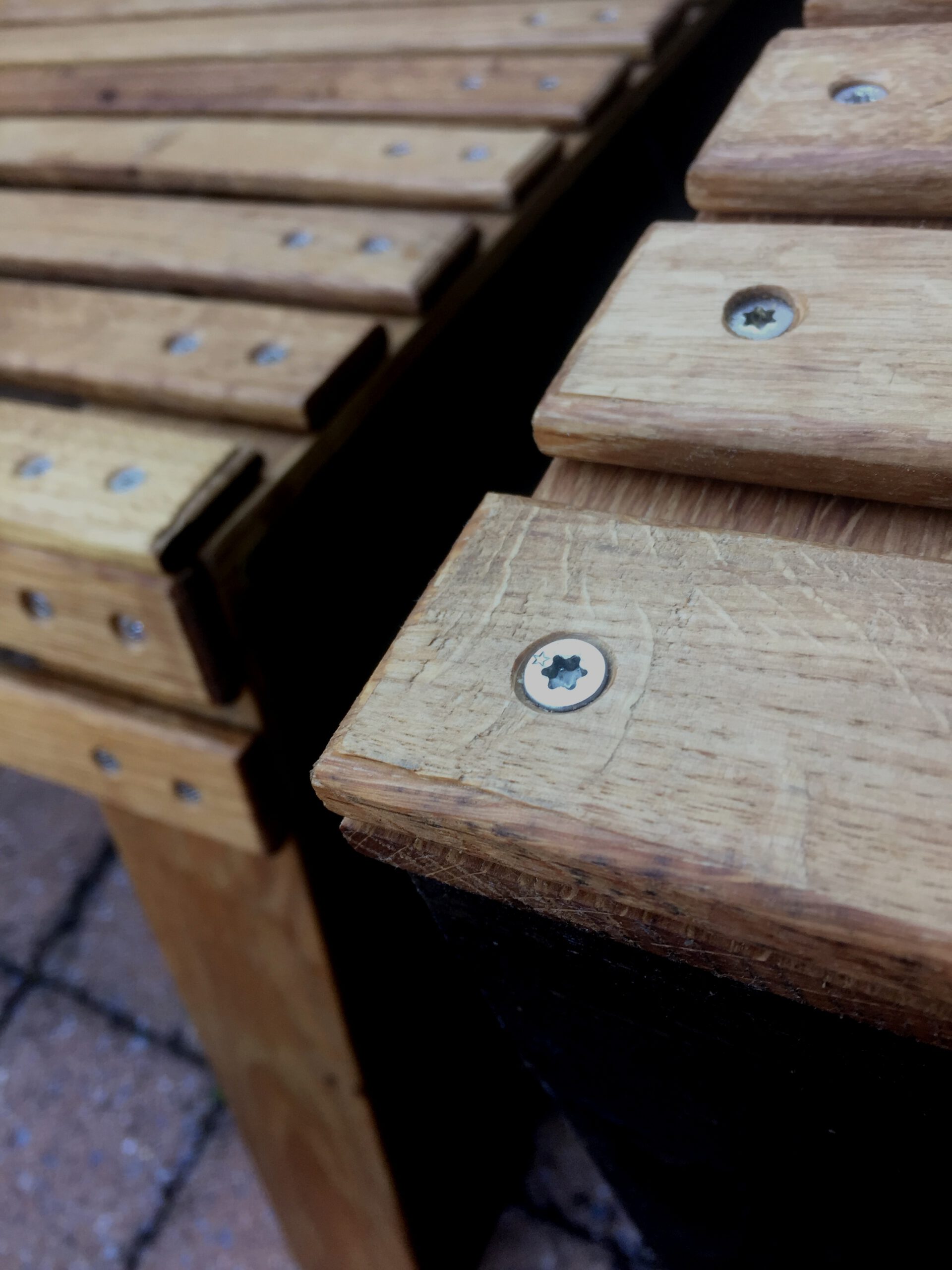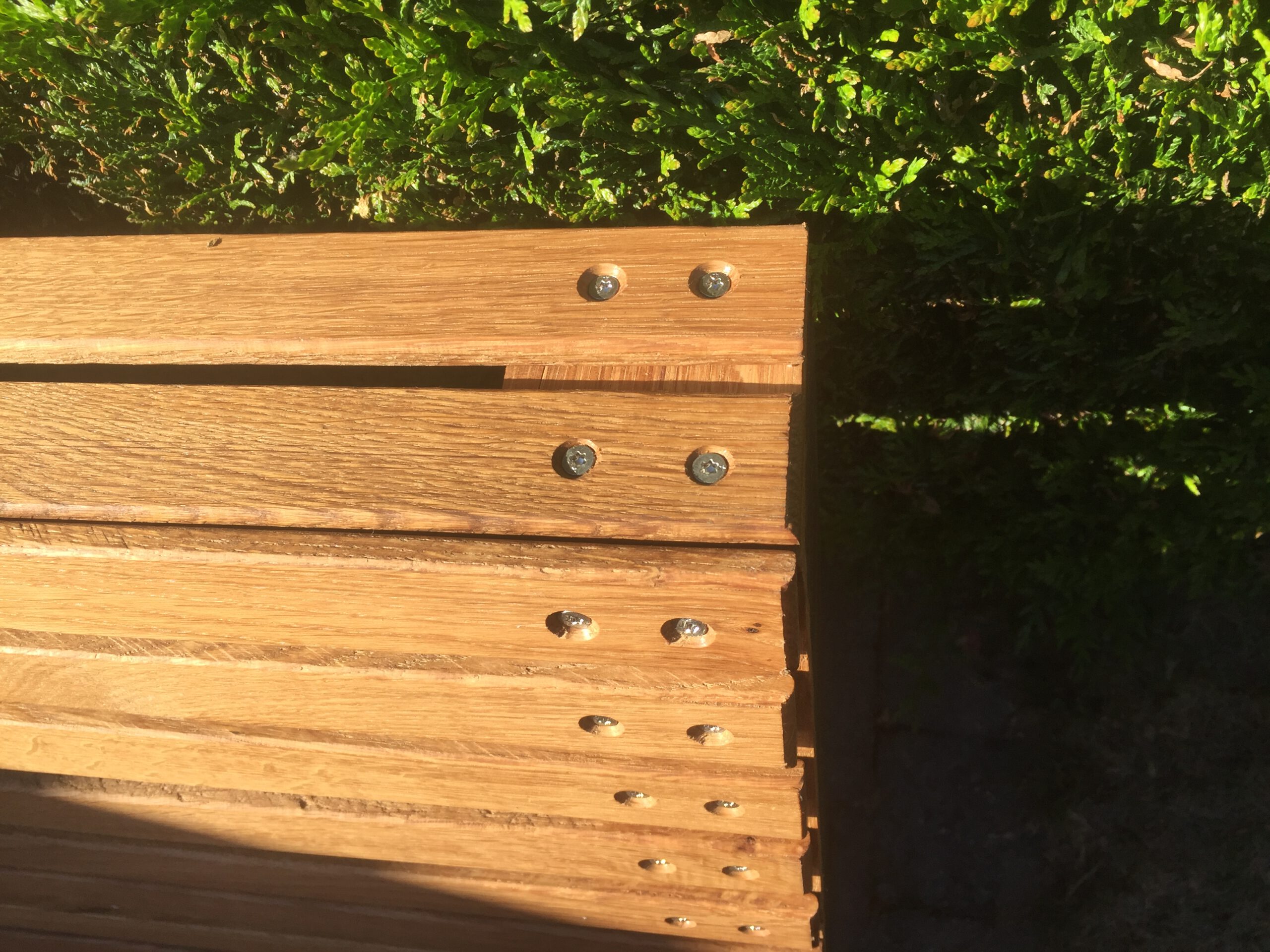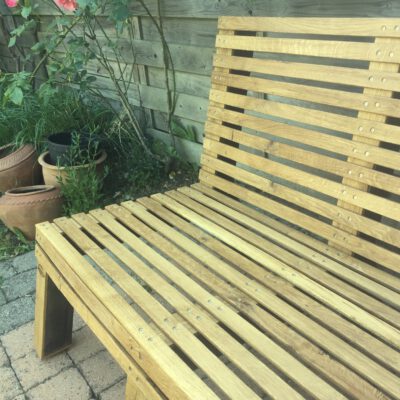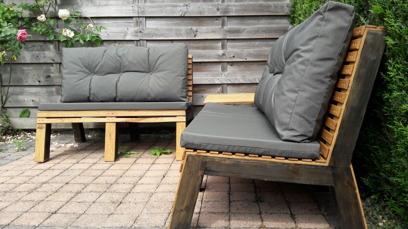 Het resultaat werd een set van twee eiken banken en een bijzettafel die ook in de hoek van de set kan staan. De banken zitten met of zonder kussens lekker relaxed. De banken zijn gemaakt van een houten frame die afgewerkt is met eiken latten.