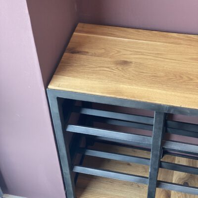 Door een stalen rek te combineren met eikenhout en oud hout voor de kratjes ontstaat er een meubel dat er uitziet alsof het er al jaren staat en dat het nooit anders geweest is.