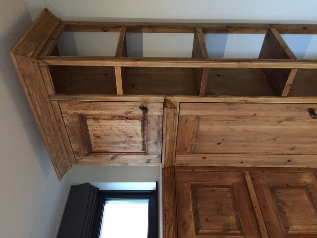 Bij deze kast moest de stijl aansluiten bij de muurtekening die gemaakt door een kunstenares Judith vd Meer. Het ensemble aan kasten is behandeld met een middel waardoor het hout er oud uitziet en vervolgens afgewerkt met olie. De handgrepen zijn gemaakt van boomtakken. Alles bij elkaar een echte Peter Rabbit Kast…